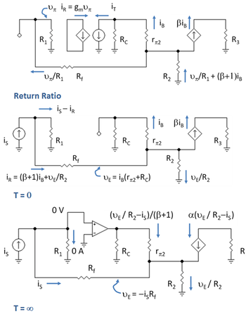 The circuit to determine G∞ is shown in the bottom panel of Figure 7. The introduction of the ideal op amp (a nullor) in this circuit is explained as follows. When T → ∞, the gain of the amplifier goes to infinity as well, and in such a case the differential voltage driving the amplifier (the voltage across the input transistor rπ1) is driven to zero and (according to Ohm's law when there is no voltage) it draws no input current. On the other hand, the output current and output voltage are whatever the circuit demands. This behavior is like a nullor, so a nullor can be introduced to represent the infinite gain transistor.