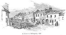 Historically, Ballingarry found fame in the mid-19th century when a rebellion broke out there on 29 July 1848 against British rule. The site of this uprising, the McCormack House, known also as the Warhouse (officially Famine Warhouse 1848) has since been designated as a national memorial and historical building by the State. It was here during the ill-fated rebellion that the national tricolour of green, white and orange was unfurled for the first time by the rebels, led by William Smith O'Brien, thus emulating the French rebels who also took to the streets with their tricolour for the first time earlier that year. Sub-Inspector Trant and 46 other local policemen took refuge from the rebels in a large two-story farmhouse, taking the five young children in the house as hostages. They barricaded themselves in, pointing their guns from the windows.[2] The house was surrounded by the rebels and a stand-off ensued. Mrs. Margaret McCormack, the owner of the house and mother of the children, demanded to be let into her house, but the police refused and would not release the children. Mrs. McCormack found O'Brien reconnoitring the house from the out-buildings, and asked him what was to become of her children and her house.