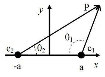 In mathematics, biangular coordinates are a coordinate system for the plane where and are two fixed points, and the position of a point P not on the line is determined by the angles and .