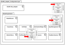 The simulation system is discretized in layers, each with its own features and requirements. Such layers are the Model Layer (ModL), where fine granularity models are implemented as discrete units,[32] the Composition Layer (CompL), where basic models are linked into more complex, aggregated models, and the Configuration Layer (ConfL), which allows providing context specific parameterization (in the software sense) for operational use. Applications can span from simple console applications to user-interacting applications based on the model-view-controller pattern, in the simplest cases linking either directly to either the ModL or the CompL, or accessing model ConfL. In all cases, the component oriented architecture allows implementing a set of functionalities which impact on the richness of functionality of the system and on its transparency. Layers implement no top-down dependency among them, hence facilitating the independent reuse of tools, utilities, and model components in different applications and frameworks.