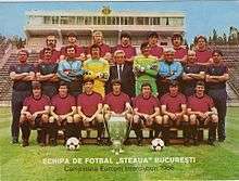 At the end of 1961 CCA changed its name once again to CSA Steaua București (Clubul Sportiv al Armatei Steaua – Army Sports Club Steaua). The club's new name translates The Star and was adopted because of the presence of a red star, symbol of most East-European Army clubs, on their crest. A poor period of almost two decades followed in which the club claimed only three championships (1967–68, 1975–76, 1977–78). Instead, the team won nine national cup trophies, for which matter they gained the nickname of cup specialists.[4] Also during this period, on 9 April 1974, Steaua's current ground, Stadionul Ghencea, was inaugurated with a friendly match opposing OFK Beograd.[5]