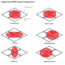 This mechanism employs a single laser beam and a set of four photodiodes to read, focus and keep track of the data coming from the disc.[50]