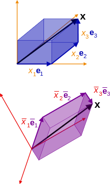In another rectangular coordinate system, x as a contravector has coordinates xi and bases ei, while as a covector it has coordinates xi and bases ei, and we have: