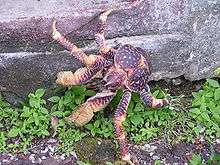 The coconut crab (Birgus latro) is the world's largest terrestrial arthropod,[38] reaching over one metre in leg span and 3.5-4 kilos in weight. As a juvenile it behaves like a hermit crab and uses empty coconut shells as protection but as an adult this giant crab climbs trees and can crack through a coconut with its massive claws. Despite its wide global distribution, it is rare in most of the areas it is found. The coconut crabs on Chagos constitute one of the most undisturbed populations in the world.[39][40] An important part of their biology is the long distances their young can travel as larvae. This means the Chagos coconut crabs are a vital source for replenishing other over-exploited populations in the Indian Ocean region.