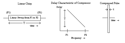 In order to compress a chirp pulse of duration T seconds, which sweeps linearly in frequency from F1 Hz to F2 Hz, a device with the characteristics of a dispersive delay line is required. This provides most delay for the frequency F1, the first to be generated, but with a delay which reduces linearly with frequency, to be T second less at the end frequency F2. Such a delay characteristic ensures that all frequency components of the chirp pass through the device, to arrive at the detector at the same time instant and so augment one another, to produce a narrow high amplitude pulse, as shown in the figure: