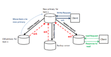 In primary-based local-write protocols,[18] primary copy moves between processes willing to perform an update. To update a data item, a process first moves it to its location. As a result, in this approach, successive write operations can be performed locally while each process can read their local copy of data items. After the primary finishes its update, the update is forwarded to other replicas and all perform the update locally. This non-blocking approach can lead to an improvement. The diagram of the local-write protocol depicts the local-write approach in primary-based protocols. A process requests a write operation in a data item x. The current server is considered as the new primary for a data item x. The write operation is performed and when the request is finished, the primary sends an update request to other backup servers. Each backup sends an acknowledgment to the primary after finishing the update operation.