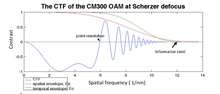 As shown in the figure, the most restrictive envelope term will dominate in damping the contrast transfer function. In this particular example, the temporal envelope term is the most restrictive. Because the envelope terms damp more strongly at higher spatial frequencies, there comes a point where no more phase signal can pass through. This is called the Information Limit of the microscope, and is one measure of the resolution.