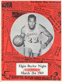 ![]() The cover of the Los Angeles Lakers program for "Elgin Baylor Night" on March 21, 1969 | |