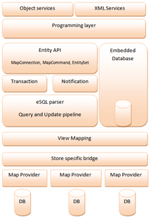 - Conceptual layer API, the runtime that exposes the programming model for coding against the conceptual schema. It follows the ADO.NET pattern of using Connection objects to refer to the map provider, using Command objects to send the query, and returning EntityResultSets or EntitySets containing the result.