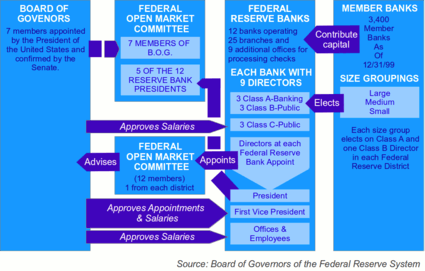 The Federal Reserve System has a "unique structure that is both public and private"[45] and is described as "independent within the government" rather than "independent of government".[46] The System does not require public funding, and derives its authority and purpose from the Federal Reserve Act, which was passed by Congress in 1913 and is subject to Congressional modification or repeal.[47] The four main components of the Federal Reserve System are (1) the Board of Governors, (2) the Federal Open Market Committee, (3) the twelve regional Federal Reserve Banks, and (4) the member banks throughout the country.