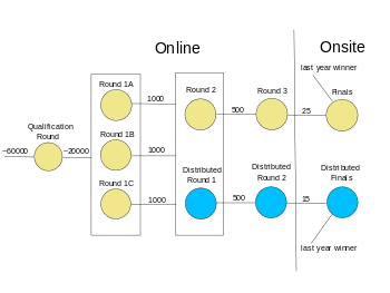 Google Code Jam structure (2016). Numbers denote how many people advance to the next round. Colors denote format of the competition: yellow – you run your code locally and submit results and the source, blue – you submit your code and Google runs it in a distributed environment.