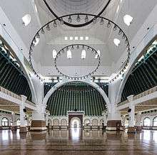 In the central courtyard are six large hydraulically operated umbrellas, inspired by the ones at Al-Masjid al-Nabawi in Medina, which are used to protect worshipers;[2] the six umbrellas represent the six tenets of iman.[3] More than 15,000 worshipers can fit in the 7,669-square-metre (82,550 sq ft) prayer area.[2][4] At the open end of the U is a series of Arabic-style arches, with Arabic calligraphs of 99 attributes of Allah, stood on 25 pillars, each representing one of the named prophets in Islam.[3] Beyond the arches is an inscription on a 3.2-metre (10 ft) tall, 7.8 ton stone from Mount Merapi, designed by Nyoman M. Alim.[1][3]