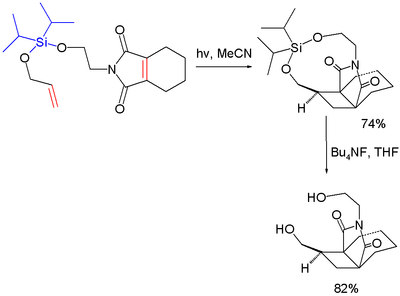 Another example is a photochemical [2+2]cycloaddition with two alkene groups tethered through a silicon acetal group (racemic, the other enantiomer not depicted), which is subsequently cleaved by TBAF yielding the endo-diol.