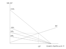 , represents his or her demand for the public good, or willingness to pay. The sum of the marginal benefits represent the aggregate willingness to pay or aggregate demand. The marginal cost is, under competitive market conditions, the supply for public goods.