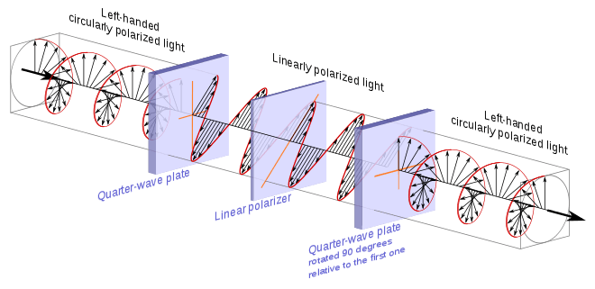 A homogeneous circular polarizer can be created by sandwiching a linear polarizer between two quarter-wave plates.[12] Specifically we take the circular polarizer described previously, which transforms circularly polarized light into linear polarized light, and add to it a second quarter-wave plate rotated 90° relative to the first one.