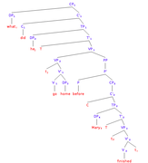 In wh-movement, an interrogative sentence is formed by moving the wh-word (determiner phrase, preposition phrase, or adverb phrase) to the specifier position of the complementizer phrase. The +q feature of the complementizer results in an EPP:XP+q feature: This forces an XP to the specifier position of CP. The +q feature also attracts the bound morpheme in the tense position to move to the head complementizer position; leading to do-support.[1]:260–262