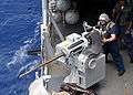 Mk 38 MOD 2 25mm autocannon gun system aboard the amphibious dock landing ship USS Pearl Harbor forward ejecting the spent casings.