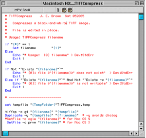 MPW included a version of make. Its syntax was conceptually similar to that of Unix make, but the MacRoman long f character to indicate dependencies. More significantly, since the limitations of the shell precluded the make program from running tools itself, it had to work by composing a script of compile/link actions to be run, then delivering that to the shell for execution. While this was good enough most of the time, it precluded makefiles that could make on-the-fly decisions based on the results of a previous action.