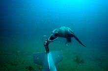 MK 6 uses dolphins and sea lions as sentries to protect harbor installations and ships against unauthorized human swimmers. MK 6 was first operationally deployed with dolphins during the Vietnam War from 1965 to 1975 and in Bahrain from 1986 to 88.[6] When an enemy diver is detected by a dolphin, the dolphin approaches from behind and bumps a device into the back of the enemy's air tank. This device is attached to a buoy which then explodes, alerting the Navy personnel of the intruder. Sea lions carry a similar device in their mouth, but instead attach it by hand-cuffing one of the enemy's limbs. The animals depend on their superior underwater senses and swimming ability to defend against counterattacks.