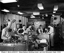 The Forward Main Battery Plotting Room was located below the waterline and inside the armored belt.[1] It housed the forward system's Mark 8 Rangekeeper, Mark 41 Stable Vertical, Mk13 FC Radar controls and displays, Parallax Correctors, Fire Control Switchboard, battle telephone switchboard, battery status indicators, assistant Gunnery Officers, and Fire Controlmen (FC's)(between 1954 and 1982, FC's were designated as Fire Control Technicians (FT's)).[1][26]