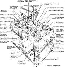 This GFCS was an intermediate-range, anti-aircraft gun fire-control system.[30] It was designed for use against high-speed subsonic aircraft.[30] It could also be used against surface targets.[30] It was a dual ballistic system.[30] This means that it was capable of simultaneously producing gun orders for two different gun types (e.g.: 5"/38cal and 3"/50cal) against the same target. Its Mk 35 Radar was capable of automatic tracking in bearing, elevation, and range that was as accurate as any optical tracking.[30] The whole system could be controlled from the below decks Plotting Room with or without the director being manned.[30] This allowed for rapid target acquisition when a target was first detected and designated by the ship's air-search radar, and not yet visible from on deck.[30] Its target solution time was less than 2 seconds after Mk 35 radar "Lock on".[30] It was designed toward the end of World War II, apparently in response to Japanese kamikaze aircraft attacks. It was conceived by Ivan Getting, mentioned near the end of his Oral history, and its linkage computer was designed by Antonín Svoboda. Its gun director was not shaped like a box, and it had no optical rangefinder. The system was manned by crew of four.[30] On the left side of the director, was the Cockpit where the Control Officer stood behind the sitting Director Operator (Also called Director Pointer).[31] Below decks in Plot, was the Mk 4 Radar Console where the Radar Operator and Radar Tracker sat.[32] The director's movement in bearing was unlimited because it had slip-rings in its pedestal.[33] (The Mk. 37 gun director had a cable connection to the hull, and occasionally had to be "unwound".) Fig. 26E8 on this Web page shows the director in considerable detail. The explanatory drawings of the system show how it works, but are wildly different in physical appearance from the actual internal mechanisms, perhaps intentionally so. However, it omits any significant description of the mechanism of the linkage computer. That chapter is an excellent detailed reference that explains much of the system's design, which is quite ingenious and forward-thinking in several respects.
