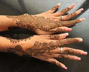 - ↑ "Mehndi Designs for Hands". Fashions Town. Retrieved 16 May 2014.