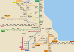 The Metra Electric District is an electrified commuter rail line owned and operated by Metra which connects Millennium Station (formerly Randolph Street Station), in downtown Chicago, with the city's southern suburbs. As of 2014, it is the second busiest of Metra's 11 lines, after the BNSF, with nearly 9.5 million annual riders.[2] While Metra does not explicitly refer to any of its lines by color, the timetable accents for the Metra Electric District are printed in bright "Panama orange" to reflect the line's origins with the Illinois Central Railroad (IC) and its Panama Limited passenger train.[3] It is the only Metra line that is solely a commuter route, which means no freight trains operate on this route. Instead, freight trains operate on tracks that are adjacent to the route. Its suburban operations line is the shortest on Metra's system, only running to fare zone G. If all the branches were combined, they would reach to zone J. It is also the only line with two downtown stations. During rush hours some trains do not reach Van Buren Street or Millennium Station.