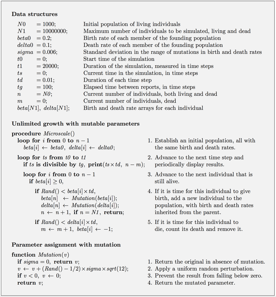 To relax other assumptions, researchers have applied computational methods. Figure 2 is a sample computational microscale algorithm that corresponds to the macroscale model of Figure 1. When all individuals are identical and mutations in birth and death rates are disabled, the microscale dynamics closely parallel the macroscale dynamics (Figures 3A and 3B). The slight differences between the two models arise from stochastic variations in the microscale version not present in the deterministic macroscale model. These variations will be different each time the algorithm is carried out, arising from intentional variations in random number sequences.