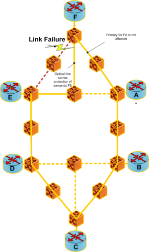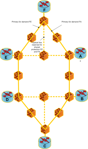 Shared backup path protection (SBPP) for multicast connections: The SBPP technique can be used for multicast connections at the optical layer because of its resource efficiency, due to the fact that the backup paths can share wavelength channels on links while their corresponding primary paths are link disjoint. Paths can share links with working paths and protection paths of other leaves. In Fig 4 FE and FA are primary paths. The optical line is reserved for shared protection of both FE and FA.