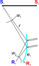 SMS optics are also calculated by applying a constant optical path length between wavefronts. Figure "SMS chain" on the right illustrates how these optics are calculated. In general, the rays perpendicular to incoming wavefront w1 will be coupled to outgoing wavefront w4 and the rays perpendicular to incoming wavefront w2 will be coupled to outgoing wavefront w3 and these wavefronts may be any shape. However, for the sake of simplicity, this figure shows a particular case or circular wavefronts. This example shows a lens of a given refractive index n designed for a source S1S2 and a receiver R1R2.