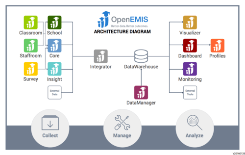 OpenEMIS is a suite of interrelated software solutions that supports data collection (Survey; Classroom; Staffroom), management (Core; School; Integrator), and analysis (Vidualizer; Monitoring; Dashboard; Analyzer; DataManager; Profiles).[4] Each application is designed to provide unique standalone features to support different information management requirements at different levels.[5] These features could be customized and integrated with existing systems. As open-source solutions, OpenEMIS benefits from coding contributions from the larger community. The OpenEMIS Initiative utilizes End-user license agreements and Contributor license agreements to ensure maintenance of standards, quality assurance and that the product remains free from commercialization.[6]