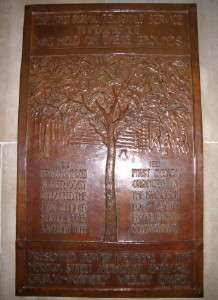 Plaque Commemorating First Formal Religious Service (Indianapolis, IN), is a public artwork by American artist Howard Petty, located on the Indiana Statehouse, which is in Indianapolis, Indiana, United States. It was created in 1923 and set in the Indiana statehouse in 1924. It commemorates the first religious services held in Indianapolis, Indiana in 1819 and the first organized church in 1821. The plaque is made of bronze and depicts a walnut tree in the foreground with a log cabin in the background. It is approximately 22 inches wide by 35.5 inches high and has a depth of .75 inches.