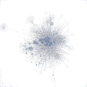 Visualization of a link structure in a wiki, created with Prefuse. Node size represents the amount of activity on the wiki on a given day. | |