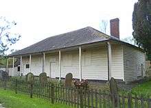 Joseph Flint was an early 19th-century shopkeeper in the village of Charlwood on the Surrey/Sussex border. Unlike most residents at the time, he was a Protestant Nonconformist and from around 1814[3] worshipped in a cottage with a small group of like-minded people rather than at St Nicholas' Church, the Anglican parish church.[4] Meanwhile, during the Napoleonic Wars, a barracks existed in the Sussex market town of Horsham.[3] A wooden guardroom or officers' mess was erected there in about 1800.[5][6][note 1] After the war the barracks was decommissioned, and the timber mess building was dismantled and transported on wagons to Charlwood. There the "strange [and] quaint" structure was re-erected in a field on a dirt track north of the village, and on 15 November 1816 it opened as an Independent Calvinistic chapel for Flint and his fellow worshippers.[3][4][5] The opening sermons at Charlwood Union Chapel, as it was originally called, were preached by ministers from chapels at Epsom and Dorking.[4] Epsom had an Independent Calvinistic chapel of its own—the denomination was "closely associated with Surrey" in the 18th and 19th centuries;[7] Bugby Chapel was opened there in 1779.[8]