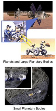 NASA has proposed use of highly capable telerobotic systems[4] for future planetary exploration using human exploration from orbit. In a concept for Mars Exploration proposed by Landis, a precursor mission to Mars could be done in which the human vehicle brings a crew to Mars, but remains in orbit rather than landing on the surface, while a highly capable remote robot is operated in real time on the surface.[5] Such a system would go beyond the simple long time delay robotics and move to a regime of virtual telepresence on the planet. One study of this concept, the Human Exploration using Real-time Robotic Operations (HERRO) concept, suggested that such a mission could be used to explore a wide variety of planetary destinations.[2]