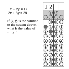 The mathematics portion of the SAT is divided into two sections: Math Test – Calculator and Math Test – No Calculator. In total, the SAT math test is 80 minutes long and includes 58 questions: 45 multiple choice questions and 13 grid-in questions.[20] The multiple choice questions have four possible answers; the grid-in questions are free response and require the test taker to provide an answer.