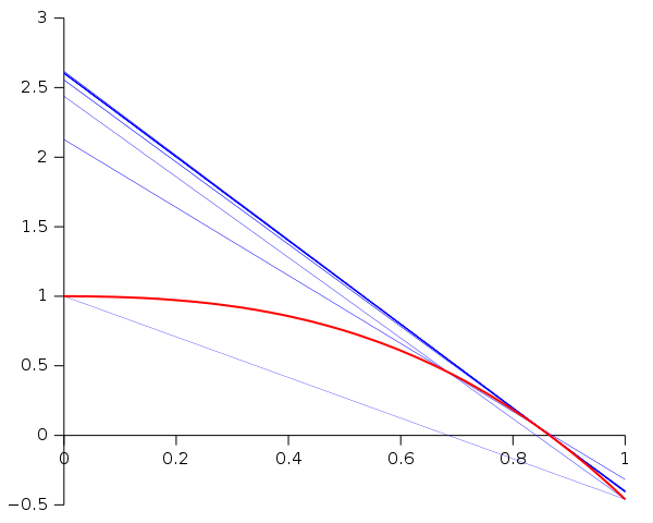 The following graph shows the function f in red and the last secant line in bold blue. In the graph, the x-intercept of the secant line seems to be a good approximation of the root of f.