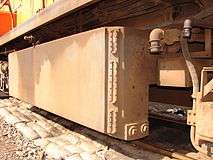 In order to be usable on the iron ore line, Class 34-000 locomotives which ended up working there, were modified to a similar fuel capacity. The inter-bogie linkage was removed and the fuel tank was enlarged, by changing it from saddle-shaped to rectangular box-shaped. To maintain its lateral balance, a slab of metal was attached to each bogie, in place of the removed linkage. In the second picture, the weld lines on the end of the enlarged fuel tank as well as the metal slab at the end of the bogie are visible.[8]