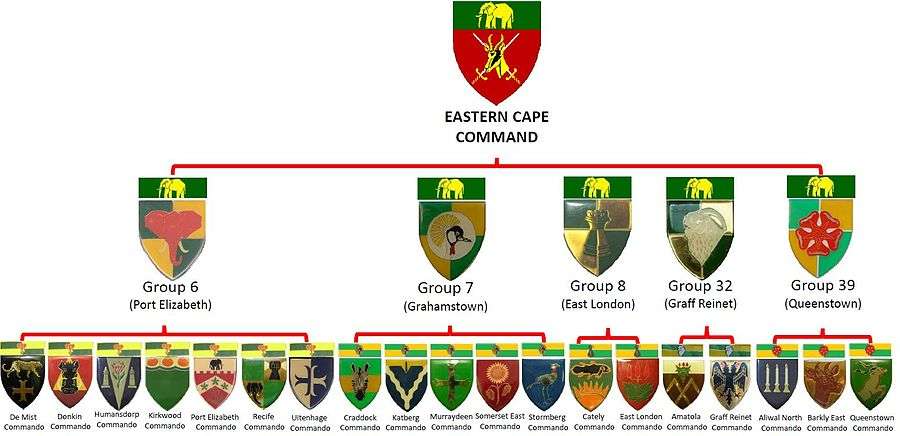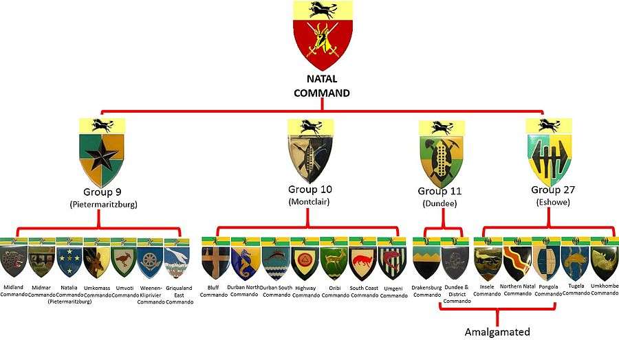 Under the SADF, Commando units were grouped regionally under Commands: (Please note: This was not a wholly static structure and units could move occaisionally between Groups, the diagrams below depict the structure from the late 1980's)