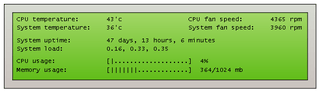Software monitors occur more commonly, sometimes as a part of a widget engine. These monitoring systems are often used to keep track of system resources, such as CPU usage and frequency, or the amount of free RAM. They are also used to display items such as free space on one or more hard drives, the temperature of the CPU and other important components, and networking information including the system IP address and current rates of upload and download. Other possible displays may include the date and time, system uptime, computer name, username, hard drive S.M.A.R.T. data, fan speeds, and the voltages being provided by the power supply.