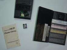 ![]() A TI-59 showing one card in the holder on the front of the calculator and another being inserted into the card reader in the side. | |