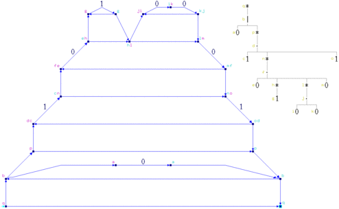 The upper right part shows the logical structure (syntax tree) of the expression, with "." denoting concatenation (assumed to have variable arity); subexpressions are named a-q for reference purposes. The left part shows the nondeterministic finite automaton resulting from Thompson's algorithm, with the entry and exit state of each subexpression colored in magenta and cyan, respectively. An ε as transition label is omitted for clarity unlabelled transitions are in fact ε transitions. The entry and exit state corresponding to the root expression q is the start and accept state of the automaton, respectively.