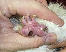 Bumblefoot is so named because of the characteristic "bumbles" or lesions as well as swelling of the foot pad symptomatic of an infection. Topical antiseptics such as Blu-Kote and Nu-Stock in addition to oral or injected antibiotics may be used to combat the infection, which if left untreated may be fatal.[1]