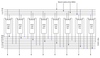 The core elements of a PMU are ACS (Add-Compare-Select) units. The way in which they are connected between themselves is defined by a specific code's trellis diagram.